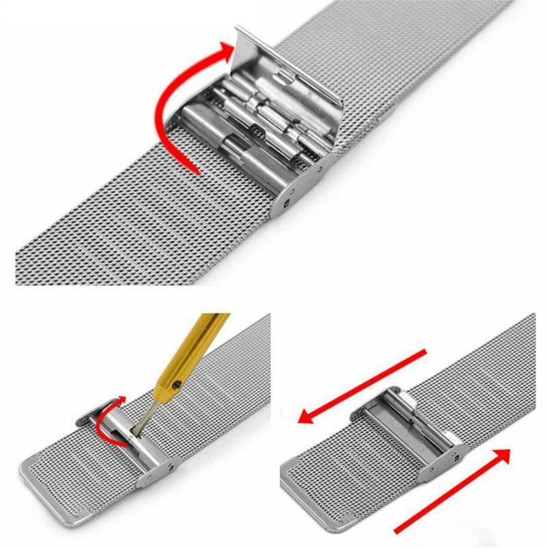 Elegantní řemínek je vyrobený z kvalitní nerezové oceli, je opatřen sponou pro pohodlné upínání, a jeho délka je snadno nastavitelná pomocí posunu spony.