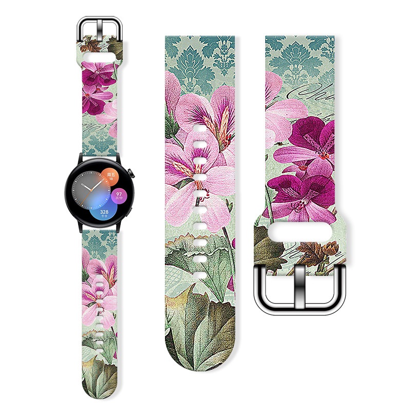 eses Silikonový květinový řemínek - Růžový/zelený, 22 mm
